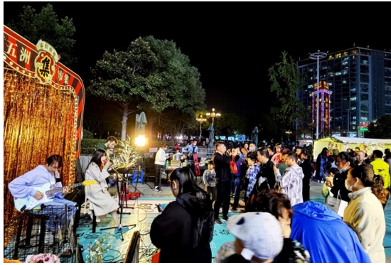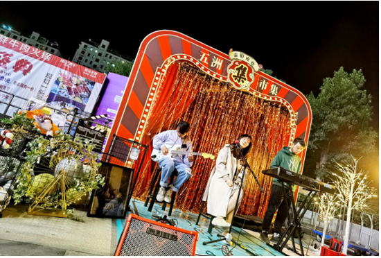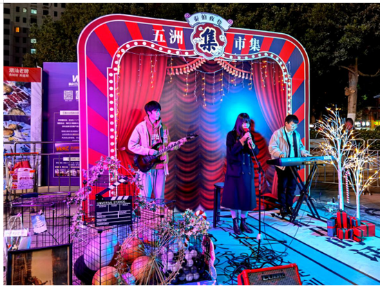 梅村五洲国际广场夜市现场氛围布置非常小清新且明亮有特色,并且每晚整点还有乐队现场演出,为现场逛街的市民朋友带去好听的歌曲。
